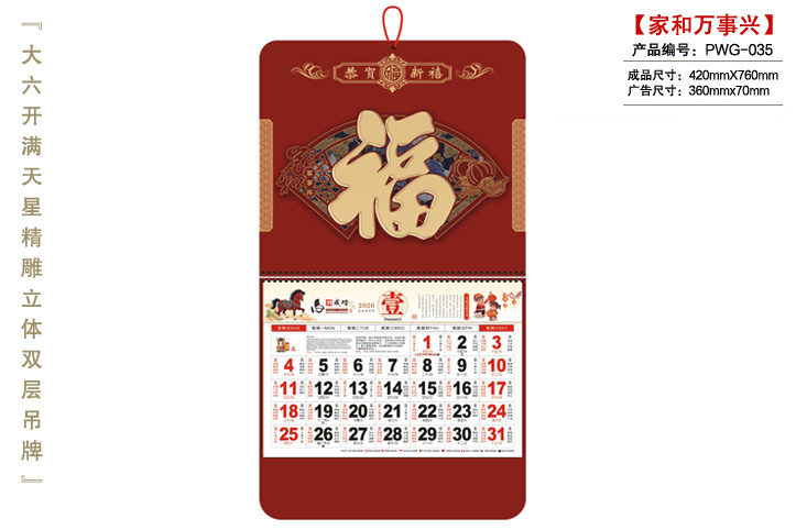 商品描述:產(chǎn)名:掛歷生產(chǎn)廠家,規(guī)格:46X65,系列:小對開金雕擊凸工藝掛歷,工期:通版3-7天,專版10-15天